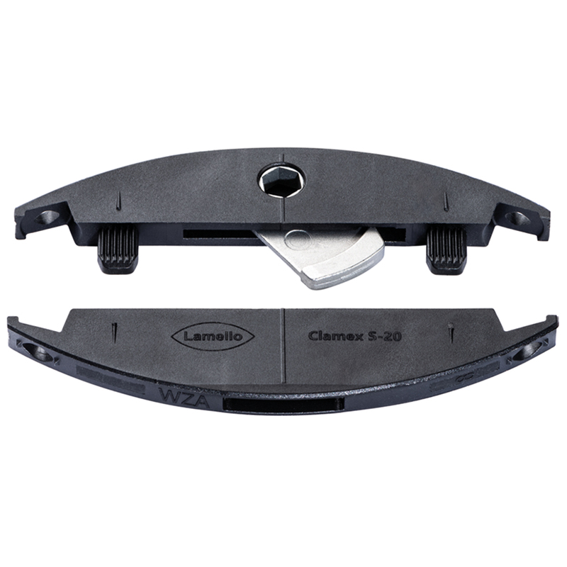 connecteur amovible pour le système Lamello pour des épaisseurs de matériau à partir de 16 mm et se fixe dans la rainure avec des vis, les rainures symétriques de 4 mm peuvent être réalisées avec n'importe quelle rainureuse, Clamex S-20 est relié à la contre-pièce par un levier et présente alors une tolérance de montage latérale, il ne nécessite pas de colle, permet des assemblages esthétiques sous tous les angles et est idéal pour les assemblages fixes ou démontables,