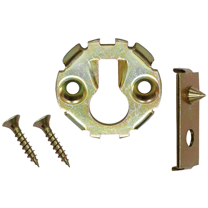 - Montage: fixer la plaque de suspension dans le trou avec les vis. Placer ensuite le pointeau sur la plaque de suspension et presser le revêtement contre la plaque de suspension pour marquer la vis. Retirer le pointeau et visser la vis de suspension à l'endroit marqué. Accrocher pour finir le revêtement.