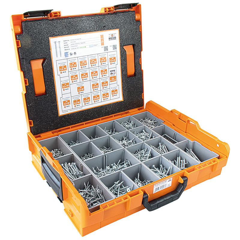 propose 3005 vis de haute qualité à filetage complet et partiel dans 20 tailles différentes, présentées dans la robuste L-BOXX 102, idéal pour les réparations et les projets plus importants, avec des embouts correspondants et le porte-embout magnétique HECO-ClicFix, les vis garantissent une qualité et des performances maximales, avec des caractéristiques uniques telles que "GripFit" et "MagicClose". La L-BOXX 102 permet un stockage sécurisé, un transport facile et un rangement organisé, empilable dans le système L-BOXX,