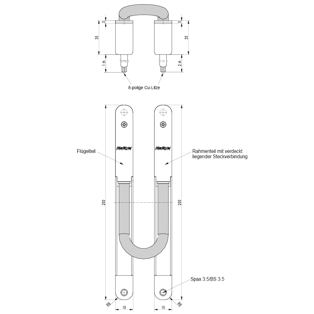 longueurs de câble: côté d'aile 1 m, côté d'huisserie 2 m,
