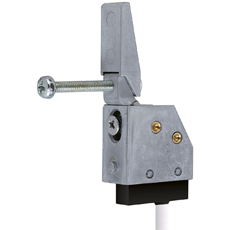 avec levier de commutation logé pivotant, pour surveiller la position du verrou, état interprétable ou affichable via installation de signalisation de cambriolage ou systèmes de surveillance, montage derrière la découpe du verrou de gâches ou de huisseries acier, câble de raccordement 4 mètres, avec notice de montage et vis, tension de service 25 V CA / CC
