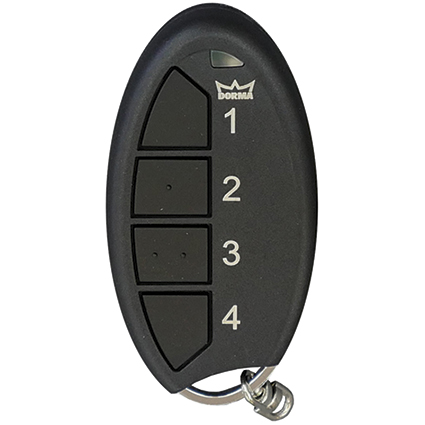 la télécommande manuelle BRC-H bi-directionnelle possède 4 canaux avec signalisation LED, boîtier résistant aux chocs avec attache porte clés DORMA, ne peut être utilisé qu'en complément de notre système de télécommande radio DORMA BRC-R