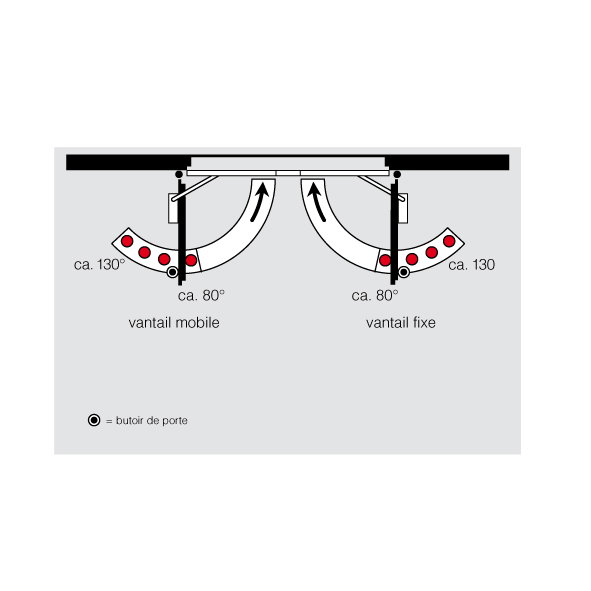 avec régulation mécanique intégrée d'ordre de fermeture pour portes à 2 vantaux et blocage électromécanique des deux vantaux, point d'arrêt réglable entre 80° et 130°, le vantail de service peut être bloqué indépendamment du vantail dormant, la force de dégagement réglable sans outil permet de déclencher sans problème l'arrêt, même à la main, lors de la fermeture de la porte, le vantail de service reste en position d'attente jusqu'à ce que le vantail dormant soit fermé et débloque le vantail de service via la régulation d'ordre de fermeture, montage côté fiche,