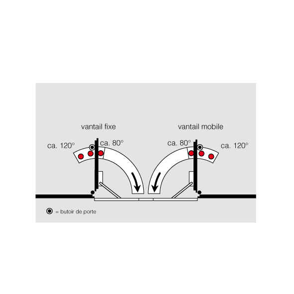 avec régulation mécanique intégrée d'ordre de fermeture pour portes à 2 vantaux et blocage électromécanique des deux vantaux, point d'arrêt réglable entre 80° et 130°, le vantail de service peut être bloqué indépendamment du vantail dormant, bloc secteur intégré et détecteur de fumée avec possibilité de raccordement d'autres détecteurs de fumée et d'un déclenchement manuel externe et d'un inverseur libre de potentiel, la force de dégagement réglable sans outil permet de déclencher sans problème l'arrêt, même à la main, lors de la fermeture de la porte, le vantail de service reste en position d'attente jusqu'à ce que le vantail dormant soit fermé et débloque le vantail de service via la régulation d'ordre de fermeture, montage côté opposé à la fiche,