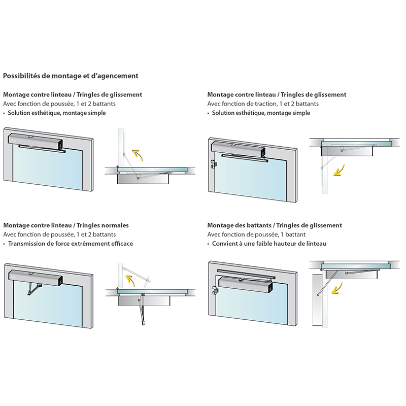 Possibilité d'installer des portes à 1 et 2 vantaux ainsi que des sas, fonction de résistance intégrée contre les lourdes charges de vent, fermeture par ressort contrôlée avec l'aide du moteur, butée de fin de course intégrée au mécanisme d'entraînement, la fonction « Inverse » intégrée permet d'assurer une ouverture hors tension anti-panique et pour évacuer les fumées, un seul mécanisme d'entraînement permet de choisir librement les modes Full Power et Low Energy, bornes de connexion permettant le montage d'accessoires (serrures, éléments de sécurité ou de commande, etc.), sorties hors potentiel pour les contacts de surveillance p.ex. aux systèmes pilotes internes via un relais circuit imprimé, contrôlé par le TÜV, en conformité avec les normes et exigences en vigueur (p.ex. EN 16005, DIN 18650)