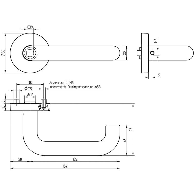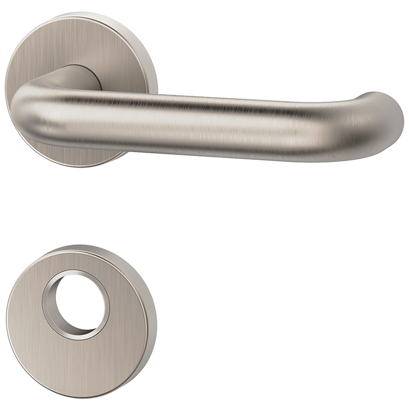 Poussoir-trou en laiton mat nickelé, sur rosace de poignée, poignée extérieure fixe sur rosace, poignée intérieure avec fermeture à baïonnette, avec ressort de rappel, trou carré de 9 mm, rosace intérieure avec ergot de guidage Ø 7,5 mm, rosace extérieure avec ergot fileté Ø 7,5 mm / M5, testé selon EN 179, testé selon EN 1906, sans vis
