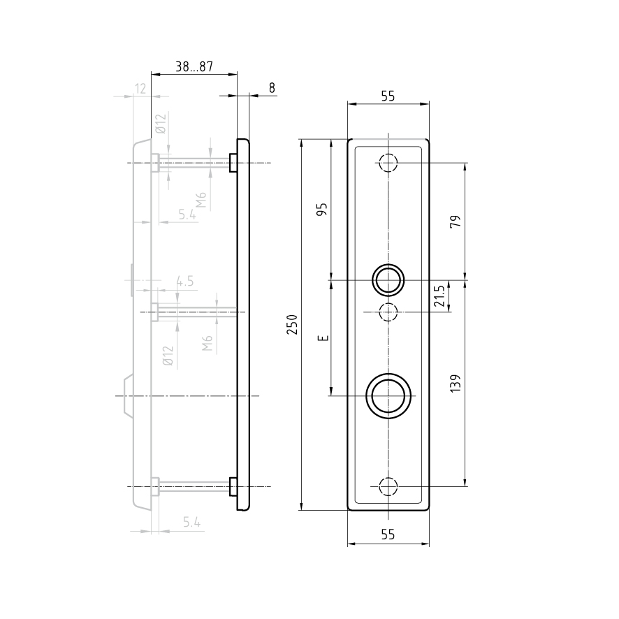 Plaque de base en acier galvanisé avec 3 trous de vis M6, avec protection à clipser en inox mat, guidage 16 mm pour poignée avec Ø de collet 20 mm,