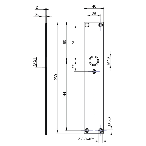 percée pour vis M5 pour vissage par paire avec plaque extérieure de sécurité, pour harmonisation optique si des plaques plates en inox sont utilisées à l'intérieur,
