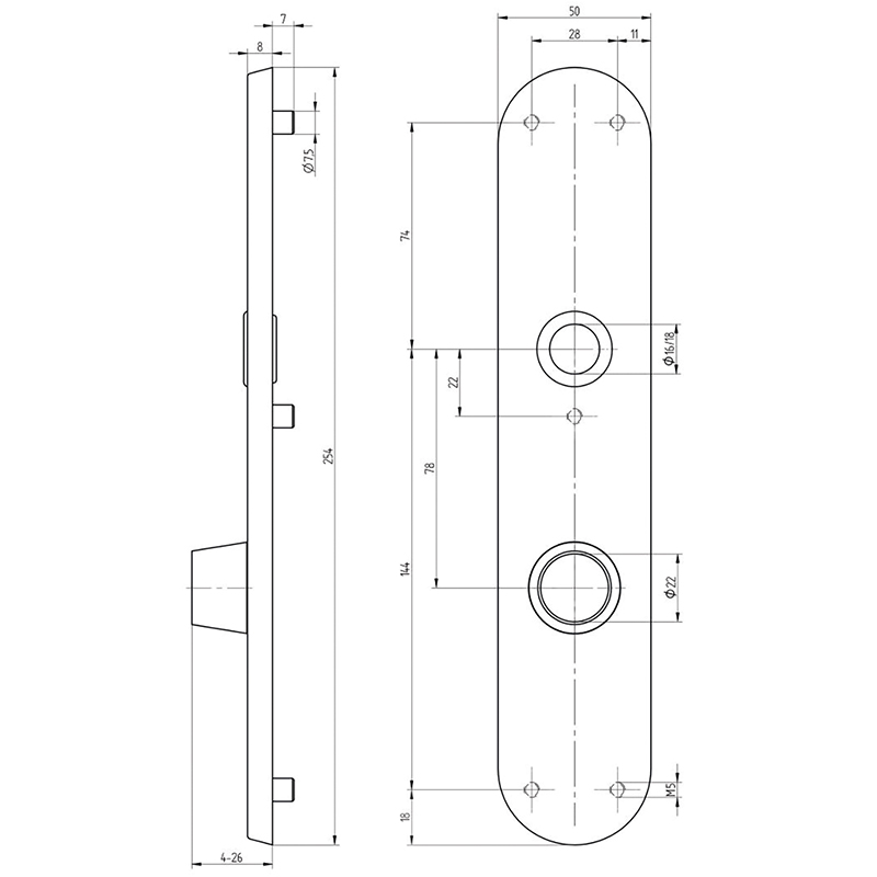 Plaque longue de sécurité MEGA 35.488, arrondie, préparée pour plaque de protection, ES 1 / RC 2