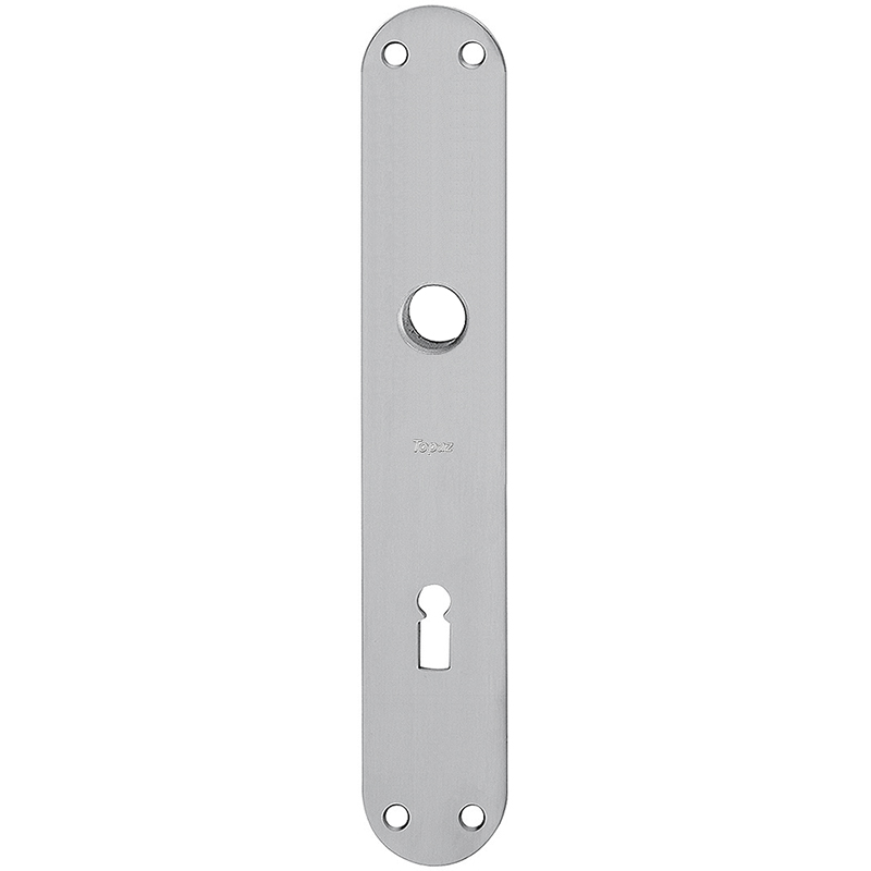Edelstahl matt, mit Drückerführung einwärts gezogen 16 mm, Mitte oberes Schraubenloch bis Mitte Drückerführung 71 mm, ohne Schrauben