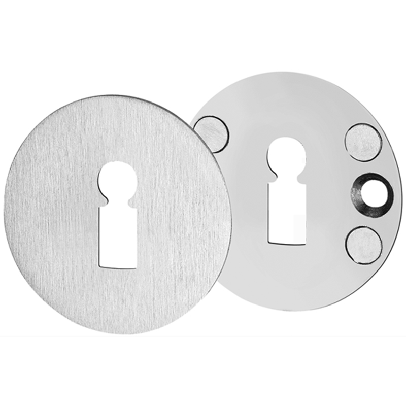 Inox mat, rosace extérieure 2 mm avec 2 raccords filetés M4 x 14 mm, rosace intérieure avec 2 trous de vis et aimants et plaque de recouvrement