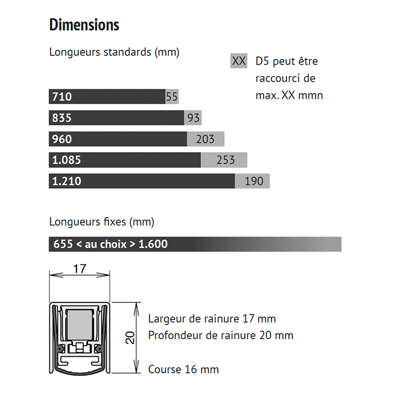 • Longueur fixe 655- 1600 mm sur demande départ usine.