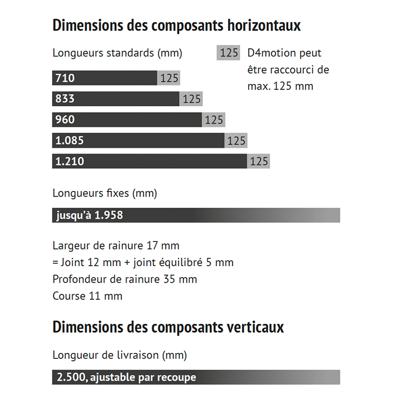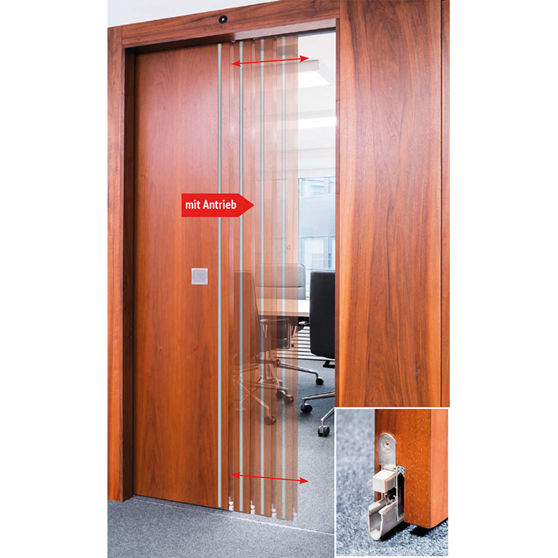 Aluminium F1 anodisé, entraînement avec détection automatique des obstacles, vitesse d'ouverture et de fermeture jusqu'à max. 25 cm/s, valeur d'insonorisation jusqu'à 36 dB (testé avec un panneau de porte avec une valeur d'insonorisation de 42 dB Rw), galets de roulement en plastique spécial avec roulements à billes de précision, joint supérieur et inférieur avec déclenchement unilatéral, adapté aux portes coulissantes en bois d'une largeur de 585 à 1958 mm et d'un poids jusqu'à 100 kg, pour une épaisseur de porte de 40 mm, largeur de rainure du joint inférieur 17 mm, joint de compensation inclus, profondeur de rainure 35 mm, course 11 mm, adaptateur de joint avec vis M8, réglage du joint sans outil, composants protégés contre la corrosion, joints supérieur et inférieur avec profilé en aluminium et profilé d'étanchéité en silicone auto-extinguible, joints verticaux avec système magnétique, profilé en aluminium et profilé d'étanchéité en silicone auto-extinguible, profilé de support mural, rail de roulement, cache et jeu de caches frontaux