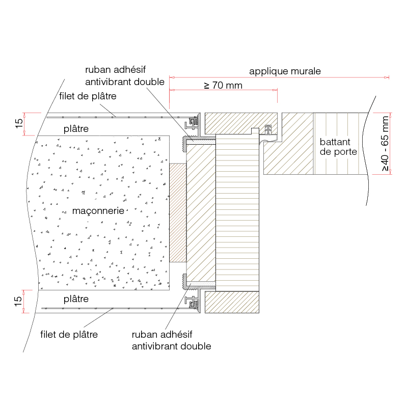 Des profils en aluminium confectionnés pour la construction de portes adhérant aux murs avec une formation de bords parfaite et un joint creux filigrane, sans problème de fissure qui devrait être colmatée avec un joint acryl inestéthique, le filet de nettoyage livré avec est clipsé dans le profil de châssis et établi ainsi une jonction ferme entre le châssis de porte et le mur / la construction sèche, avec du ruban adhésif double face pour une installation rapide et professionnelle, avec instructions de montage