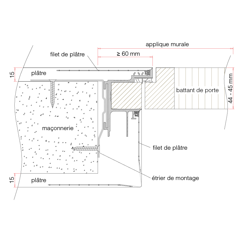 Des profils en aluminium confectionnés pour la construction de portes adhérant aux murs avec une formation de bords parfaite et un joint creux filigrane, sans problème de fissure qui devrait être colmatée avec un joint acryl inestéthique, le filet de nettoyage livré avec est clipsé dans le profil de châssis et établi ainsi une jonction ferme entre le châssis de porte et le mur / la construction sèche, Pour un montage rapide et approprié sont prévus les étriers de montage et les raccords d'angle avec instructions de montage