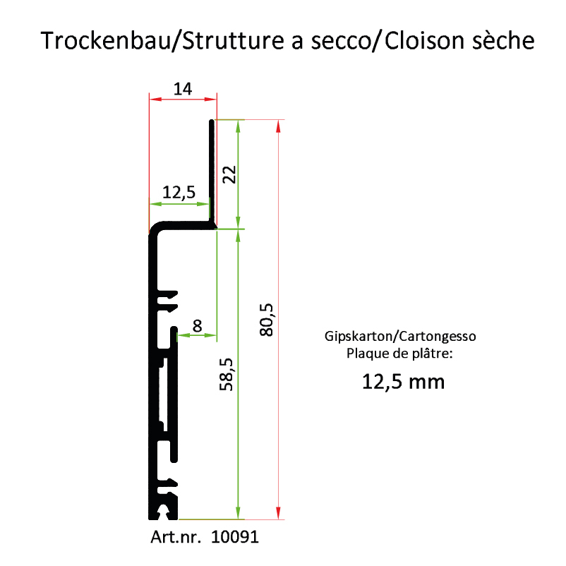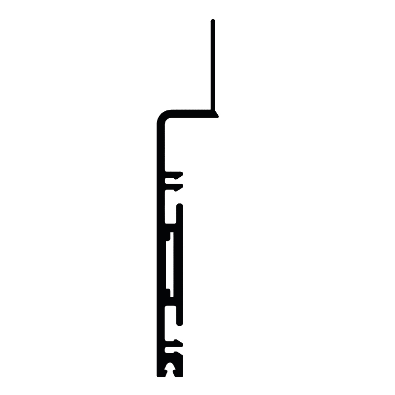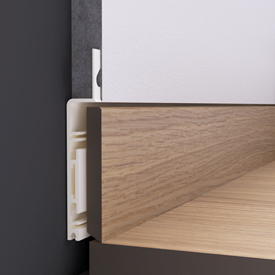 Profilé en plastique pour la réalisation de plinthes à fleur de mur, adaptés aux plinthes en bois, en carrelage, en moquette et aux plinthes préfabriquées KLICK-IN en aluminium, munis d'un ruban adhésif double face, avec pièces de jonction enfichables pour relier les différents profilés sans soudure et sans bord visible, adaptés aux plaques de plâtre, hauteur de plinthe visible : env. 60-80 mm, sans profilé de recouvrement