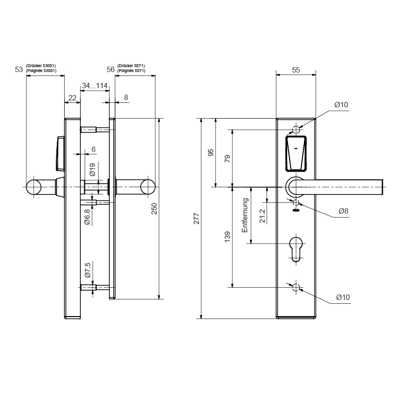 Ferrure de sécurité électronique fonctionnant à piles pour portes pleines intérieures et extérieures, de l'extérieur, l'ouverture et la fermetures sont actionnées en lisant le support RFID, la poignée intérieure permet d'ouvrir la porte à tout moment, conformité à la norme EN179 assurée avec la poignée de porte adaptée