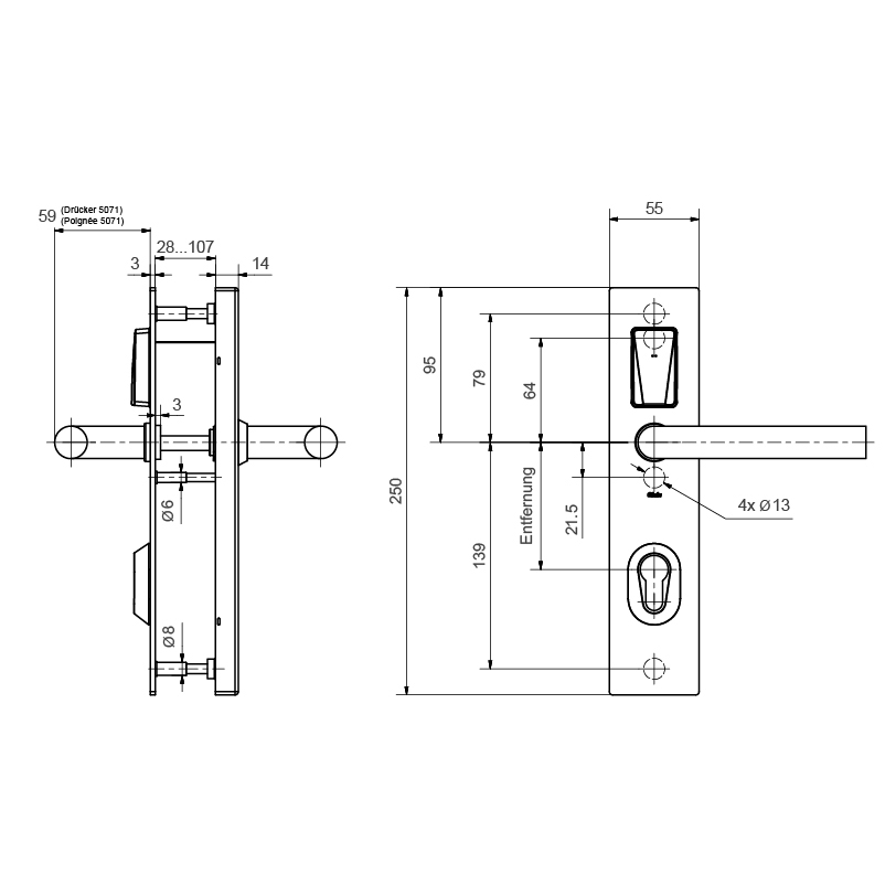 Ferrure de sécurité électronique fonctionnant à piles pour portes pleines intérieures et extérieur, de l'extérieur, l'ouverture et la fermeture sont actionnées en lisant le support RFID, la poignée intérieure permet d'ouvrir la porte à tout moment, conformité à la norme EN179 assurée avec la poignée de porte adaptée