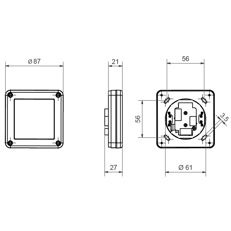 - Montage apparent / encastré en 1 bloc, dimensions 87 x 87 mm
