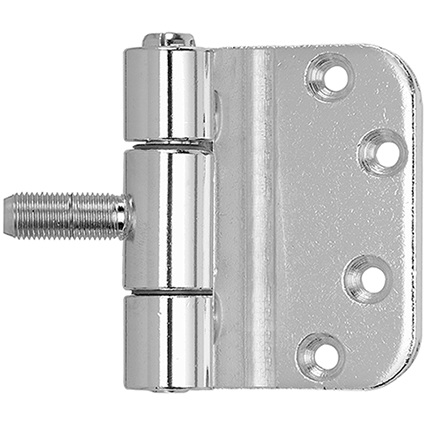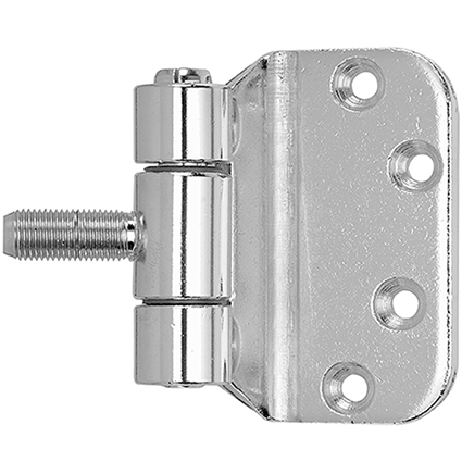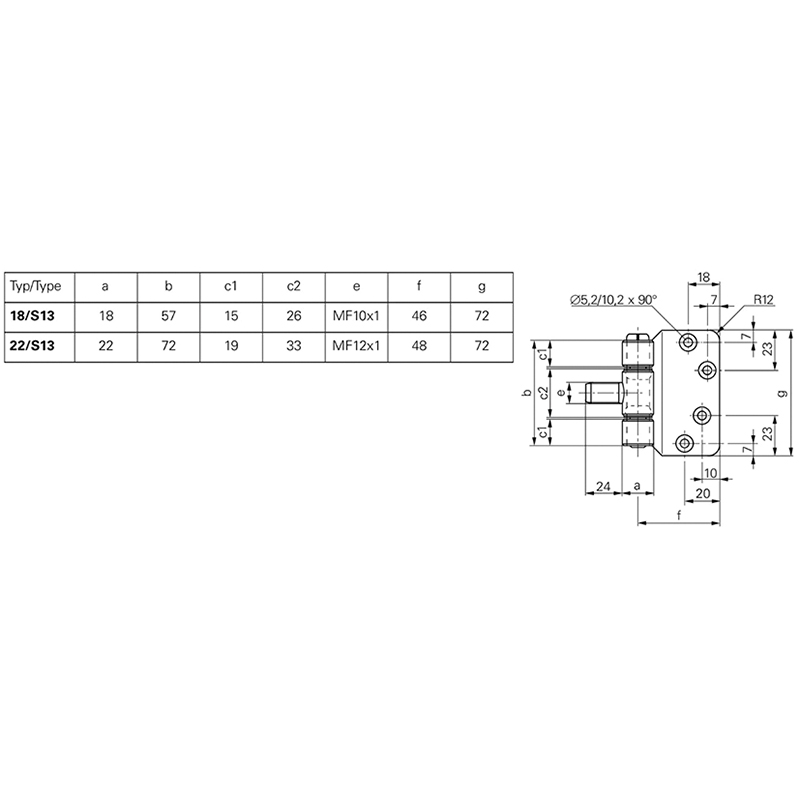 Acier galvanisé, pour portes bois noyées, avec palier lisse Hostaform, partie fiche à patte avec axe de 13 mm, hauteur de platine 72 mm, partie huisserie sur HE 18 avec filetage fin métrique MF10 x 1, partie huisserie sur HE 22 avec filetage fin métrique MF12 x 1, force portante avec 2 fiches env. 80 kg