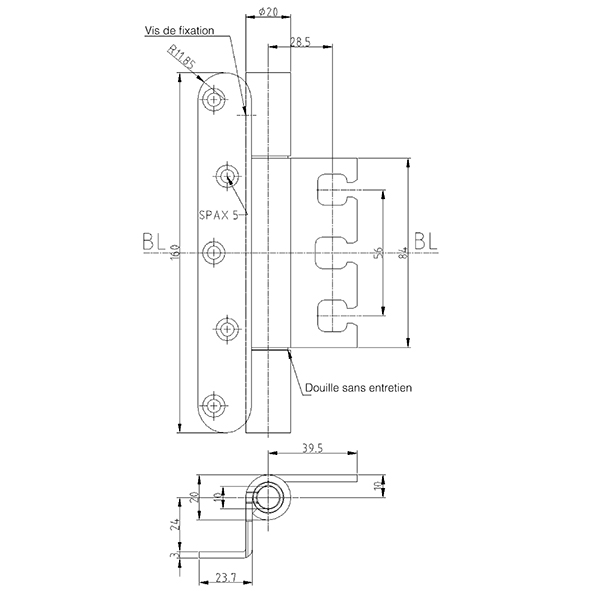 inox brossé, pour portes à recouvrement, sans entretien, avec goupille de sécurité, construit un démontage, épaisseur de platine 3 mm, pour l'utilisation sur des portes dans des voies d'évacuation et de secours avec des exigences en matière de protection contre la fumée et l'incendie, force portante, hauteur de platine 120 mm, avec 2 fiches env. 100 kg, force portante, hauteur de platine 160 mm, avec 2 fiches env. 120 kg