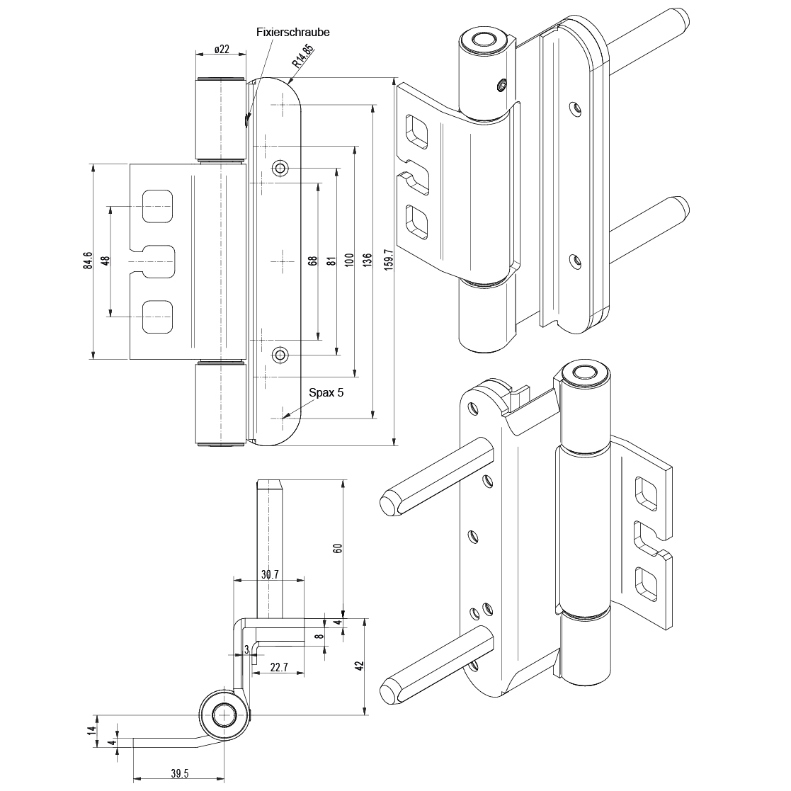 inox brossé, pour portes à recouvrement de 18 mm, joint de vantail pour type de ferrure à feuillure, sans entretien, tourillon porteur pour type de ferrure à feuillure et à fleur (vissé), coudé, épaisseur de ressort 4 mm, classe de résistance 3 (anti-effraction), jeu de fixation 13,5 mm, pour l'utilisation sur des portes dans des voies d'évacuation et de secours avec des exigences en matière de protection contre la fumée et l'incendie, force portante avec 2 fiches env. 200 kg