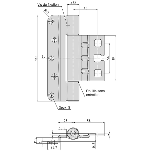 inox brossé, pour portes affleurantes à rainure, sans entretien, avec goupille de sécurité, construit un démontage, épaisseur de platine 4 mm, pour l'utilisation sur des portes dans des voies d'évacuation et de secours avec des exigences en matière de protection contre la fumée et l'incendie, force portante avec 2 fiches env. 160 kg
