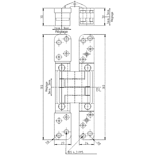 Châssis acier, platines acier, pour portes noyées, avec la porte fermée, la bande est invisible, réglage tridimensionnel, sans entretien, avec vis visibles ou modèle Design, pour l'utilisation sur des portes dans des voies d'évacuation et de secours avec des exigences en matière de protection contre la fumée et l'incendie, avec vis de montage, force portante avec 2 fiches env. 120 kg