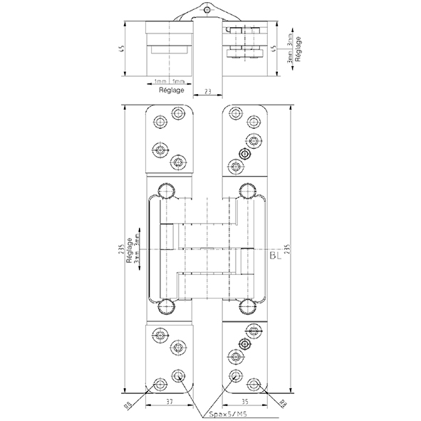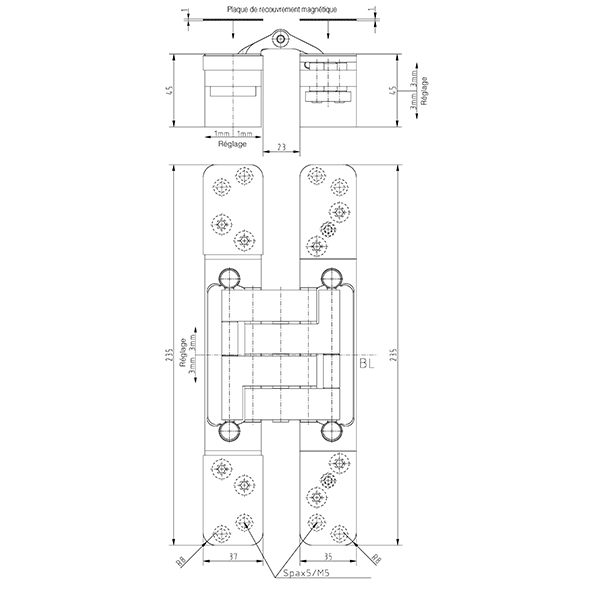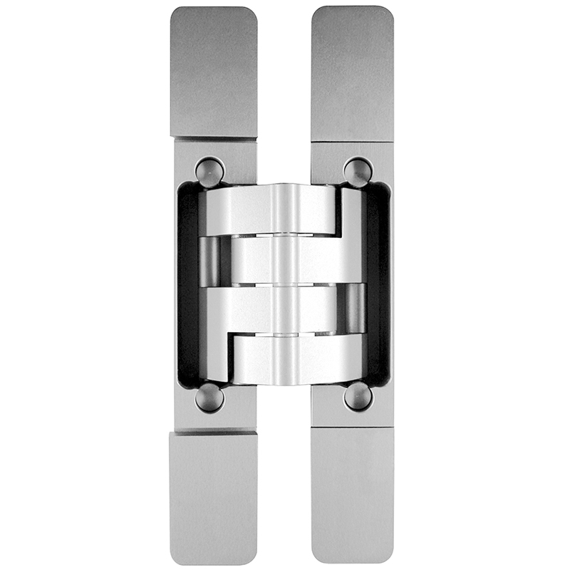 Châssis aluminium, platines acier, pour portes noyées, avec la porte fermée, la bande est invisible, réglage tridimensionnel, sans entretien, avec vis visibles ou modèle Design, pour l'utilisation sur des portes dans des voies d'évacuation et de secours avec des exigences en matière de protection contre la fumée et l'incendie, sans vis, force portante avec 2 fiches env. 150 kg