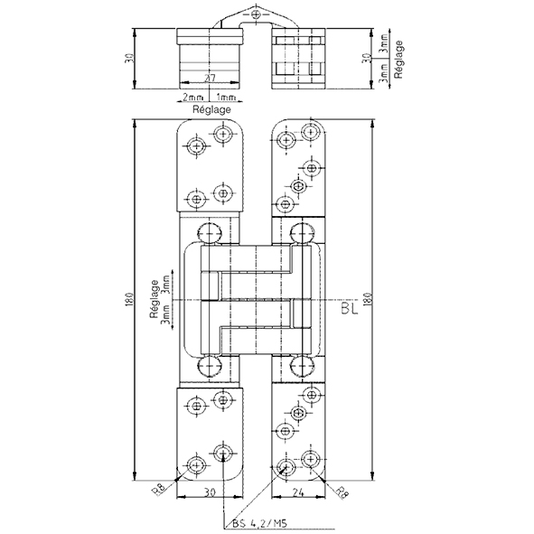 Châssis aluminium, platines acier, pour portes noyées, avec la porte fermée, la bande est invisible, réglage tridimensionnel, sans entretien, cache dans la partie châssis, pour l'utilisation sur des portes dans des voies d'évacuation et de secours avec des exigences en matière de protection contre la fumée et l'incendie, avec vis de montage, force portante avec 2 fiches env. 100 kg