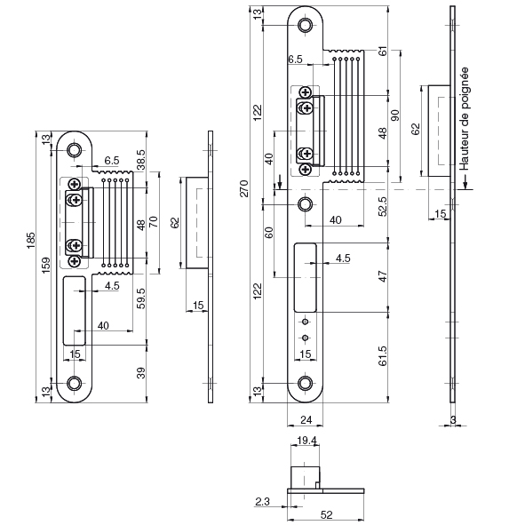 pour verrouillage multipoints FlipLock, consistant en 1 gâche centrale et 2 gâches supplémentaires, sans vis