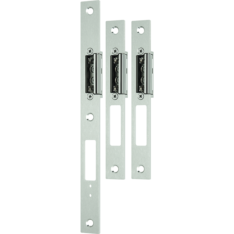 Inox mat, carré, avec pièce de rechange, réglable de 0 à 3 mm, avec découpe pour verrou et bec-de-cane, gâche centrale préparé pour le contact de commutation de boulon 1886, utilisable universel DIN à droite et DIN à gauche, set à 3 pièces, consistant en 1 gâche centrale et 2 gâches supplémentaires, sans vis