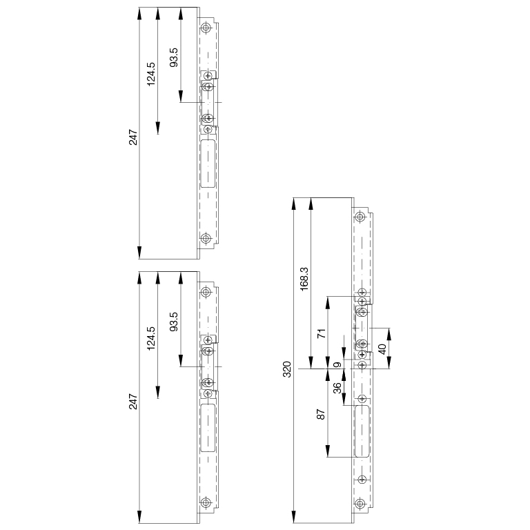 Gâche centrale et gâche vers le haut et gâche vers le bas