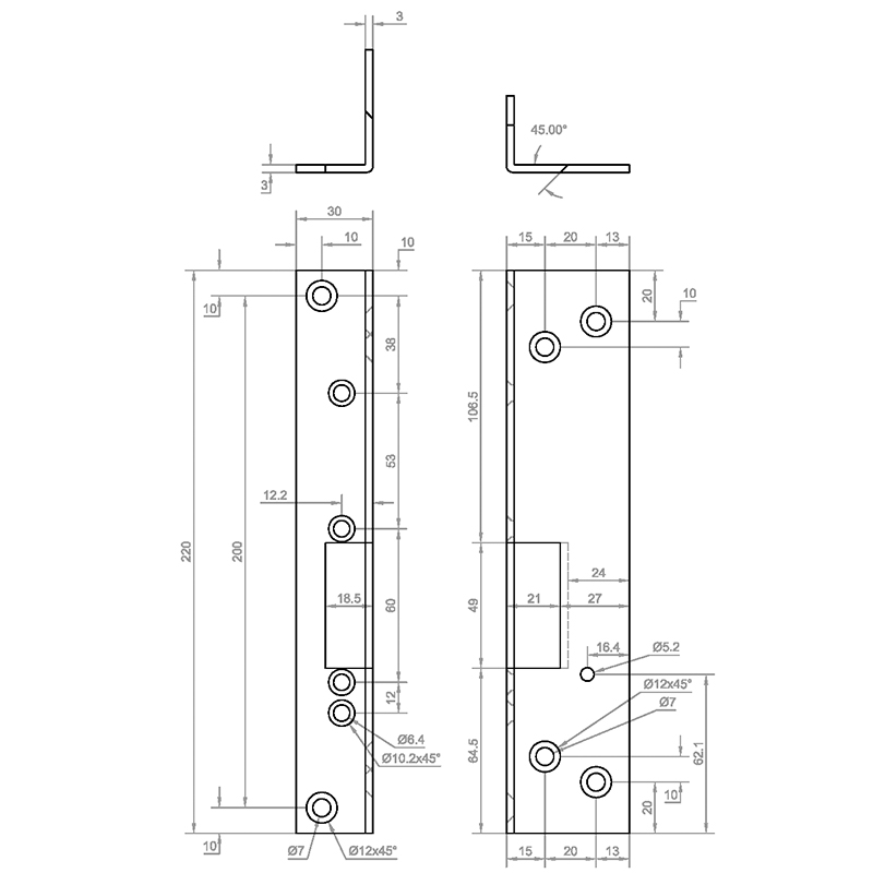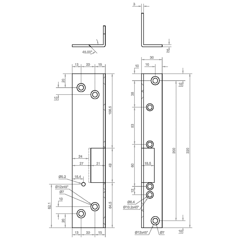 inox mat, pour gâche de sorties de secours TV5, sans découpe pêne et avec 2/4 trous de fixation