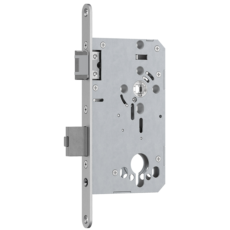 Schaltschloss dient zur automatischen Verriegelung des Standflügels, mit Kunststoffzapfen für Verriegelungsstange oben, geprüft nach EN 179, EN 1125