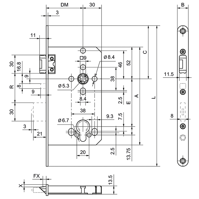 Inox mat, contre-boitier configurable, boîtier de serrure central pour têtières vissées, maintien de la béquille en position haute actif, fouillot forcé 9 mm, pontage de l'entrebâillement 2 - 5 mm, tiges de verrouillage protégées contre le recul, sans têtière, testé selon EN 179, EN 1125, EN 1634, EN 12209