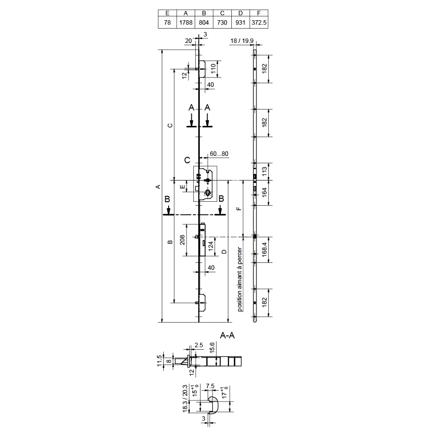 77 mm, hauteur de cremone 931 mm, positions pênes supérieure 730 / inférieure 804 mm,
