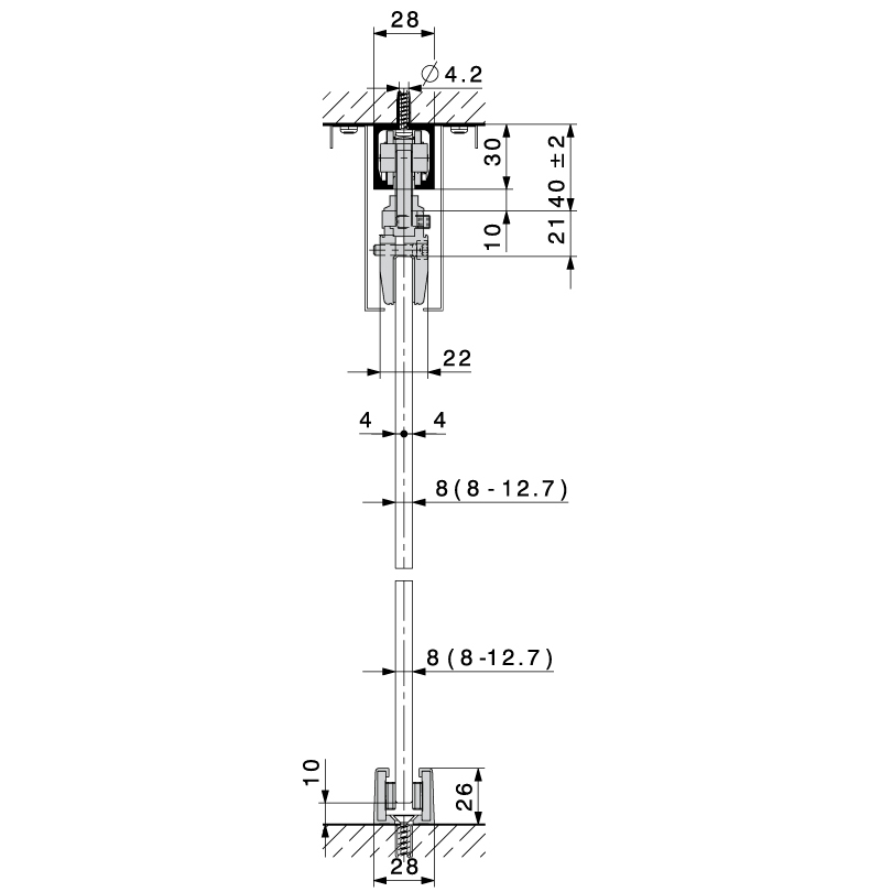 avec fixation par serrage pour portes coulissantes totalement vitrées, pour montage au plafond, chariots avec technique de paliers lisses pour un fonctionnement très silencieux, réglable en hauteur sans suspension de la porte, pour verre 8 - 12,7 mm, sans guidage de sol