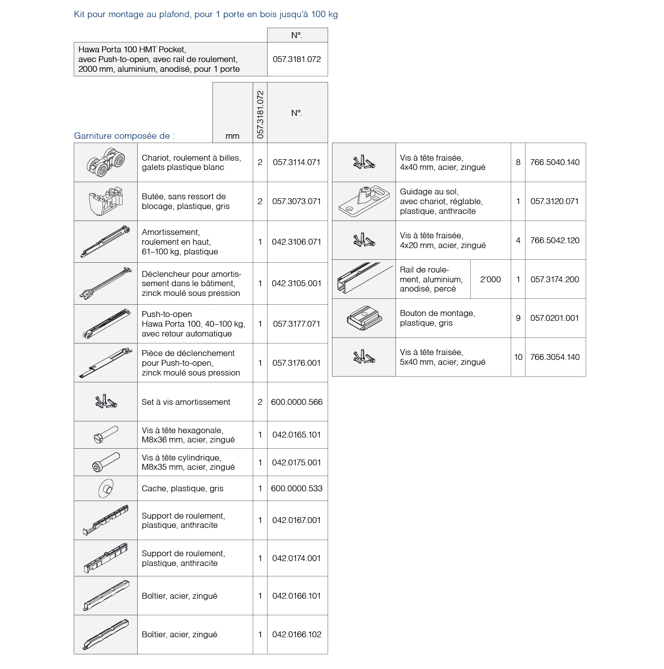 Pour montage au plafond, porte escamotable, réglable en hauteur et latéralement, chariots avec paliers lisses ou roulements à billes et roues plastique, avec ensemble complet comprenant un rail de roulement de 2000 mm et Push-to-open