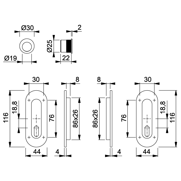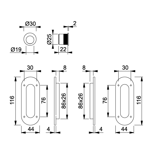 2 cuvette pour porte coulissante 44 x 116 mm,