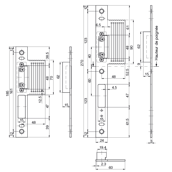 Inox mat, carré, avec pièce de rechange, réglable de 0 à 3 mm, avec découpe pour verrou et bec-de-cane, gâche centrale préparé pour le contact de commutation de boulon 1886, utilisable universel DIN à droite et DIN à gauche, set à 3 pièces, consistant en 1 gâche centrale et 2 gâches supplémentaires, sans vis