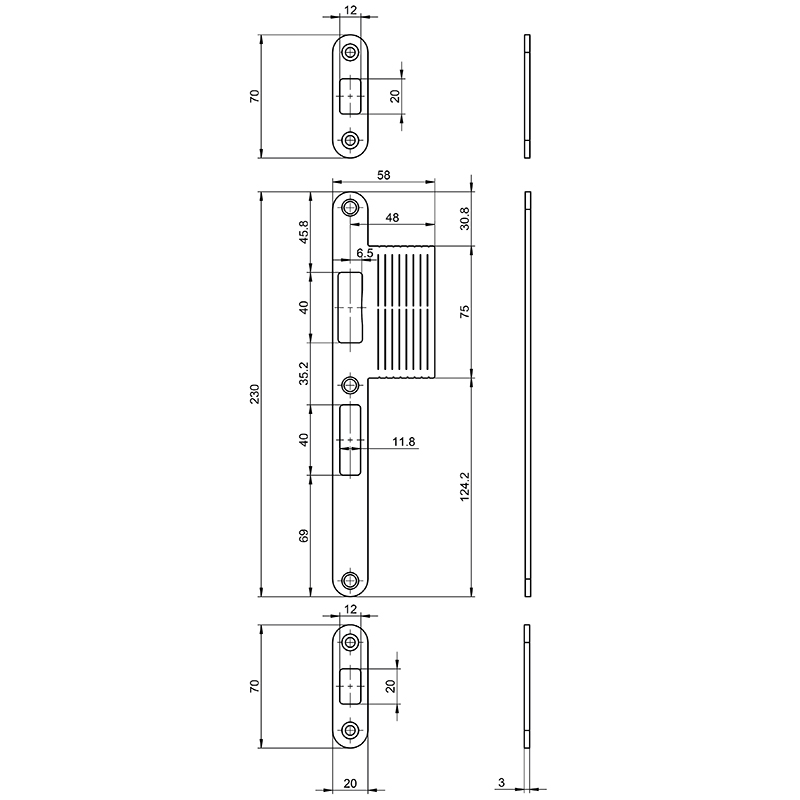 - 1 gâche à languette principale 230 x 20r/58 x 3 mm,