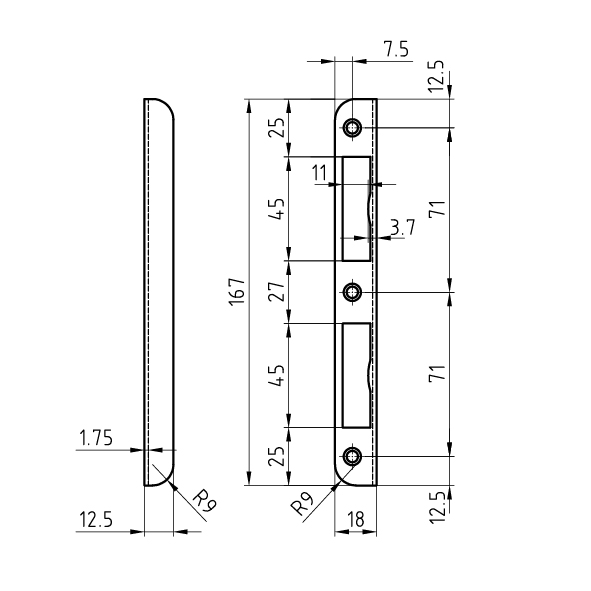 Acier galvanisé, inox mat ou laiton poli, avec découpe pour verrou et bec-de-cane, permutable universel DIN à droite et DIN à gauche, sans vis