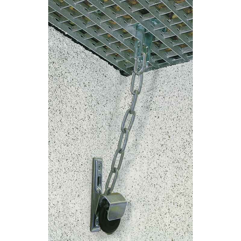 Acier galvanisé, construction stable, avec chaîne flexible ou avec profilé métallique, pour protéger contre les tentatives de soulèvement, avec plaque de recouvrement plate 105 x 75 mm, serrure avec mécanisme de verrouillage à ressort pour une ouverture rapide par en bas, avec recouvrement de serrure pour tentatives d'effraction par en haut, garniture comprenant: 2 sécurités supplémentaires pour caillebotis avec vis et chevilles