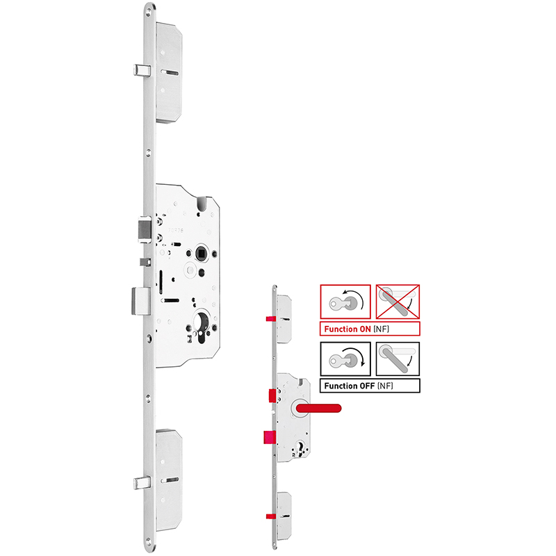 serrure multipoints à autoverrouillage avec blocage du bec-de-cane intégré, réversible DIN gauche et droite avec blocage, commande d'exécution mécanique et fonction nuit, pour une utilisation dans les portes d'entrée de maisons et d'appartements ainsi que les bâtiments industriels, la sortie est possible à tout moment par la piognée intérieure sans fonction de nuit, si la fonction nuit (NF) est volontairement activée par le cylindre, la poignée intérieure est bloquée, une sortie est alors seulement possible par la rétraction du bec-de-cane, ainsi, par ex. des enfants ne peuvent pas sortir de la maison sans moyen d'identification, cela accroît également la protection contre les effractions car il n'est pas possible de manipuler la poignée intérieure depuis l'extérieur, utilisation depuis l'extérieur en actionnant le cylindre la rétraction du bec-de-cane (button / barre), bec-de-cane amorti, testée selon DIN 18251-3, EN 1634