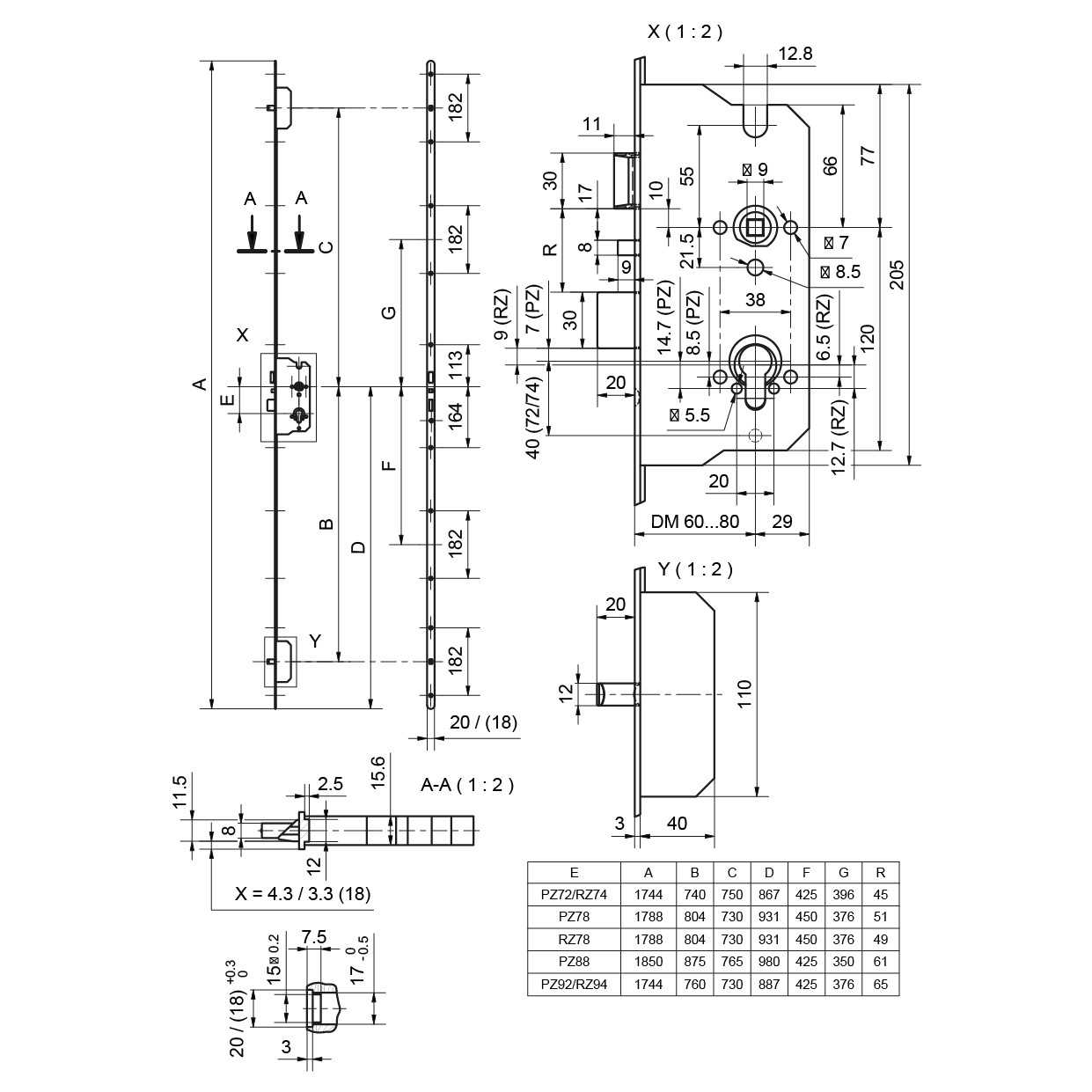 Serrure multipoints GLUTZ MINT 18991 SV NF, autoverrouillage, fonction nuit, bec-de-cane confort amorti, réversible, têtière arrondie 18 / 20 x 1788 mm, inox mat