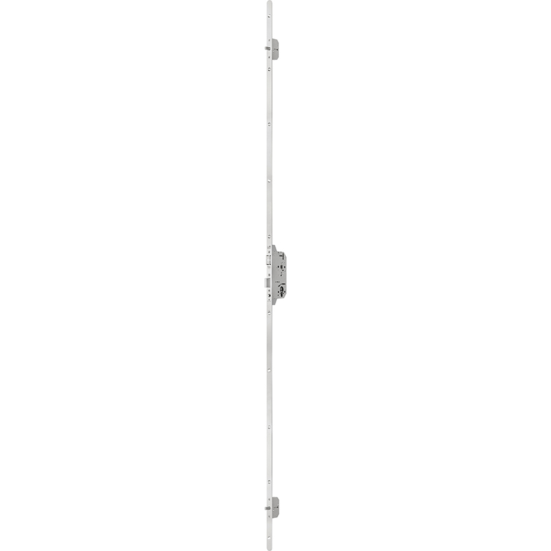 inox, commutable de la commande par poignée de porte / par clé, verrouillage à quatre points, deux pênes dormants supplémentaires et un pêne dormant de serrure, blocage du pêne demi-tour, avance du pêne dormant et des pênes dormants supplémentaires 20 mm, une vitesse, rappel automatique de la poignée,